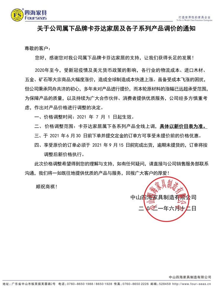 關于公司屬下品牌卡芬達家居及各子系列產(chǎn)品調(diào)價的通知